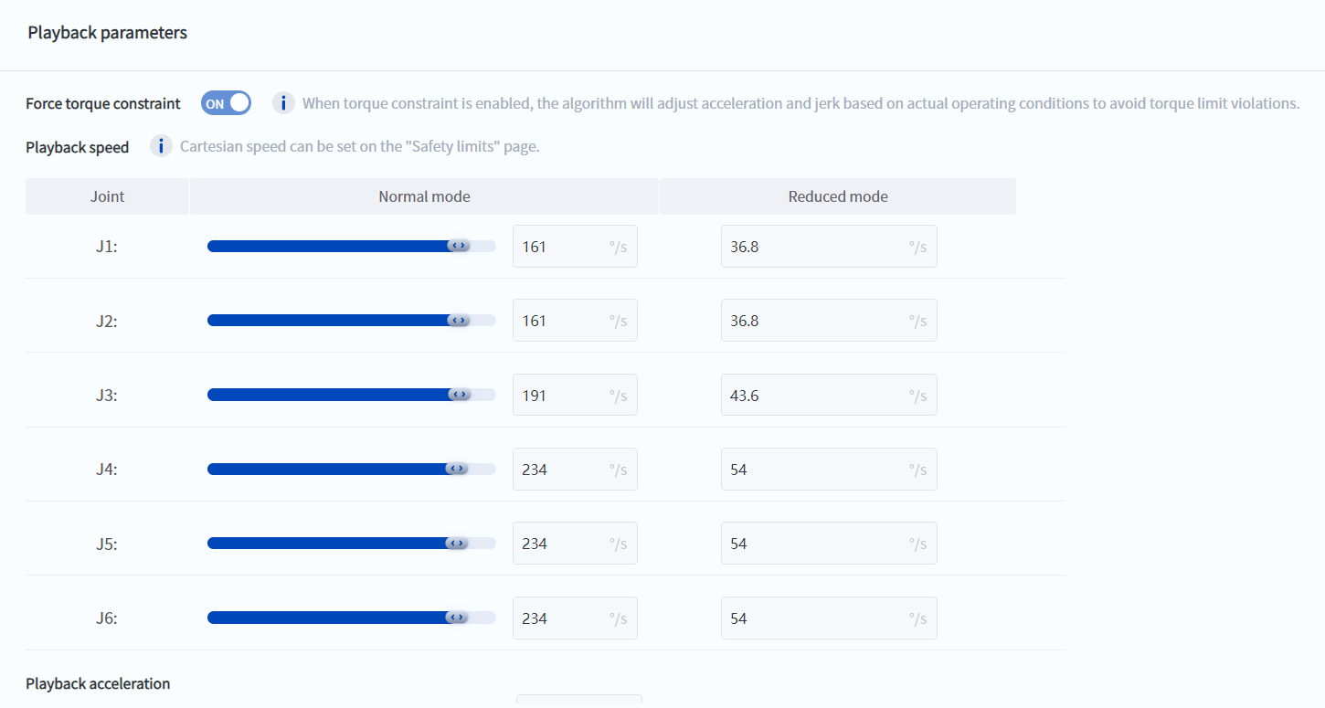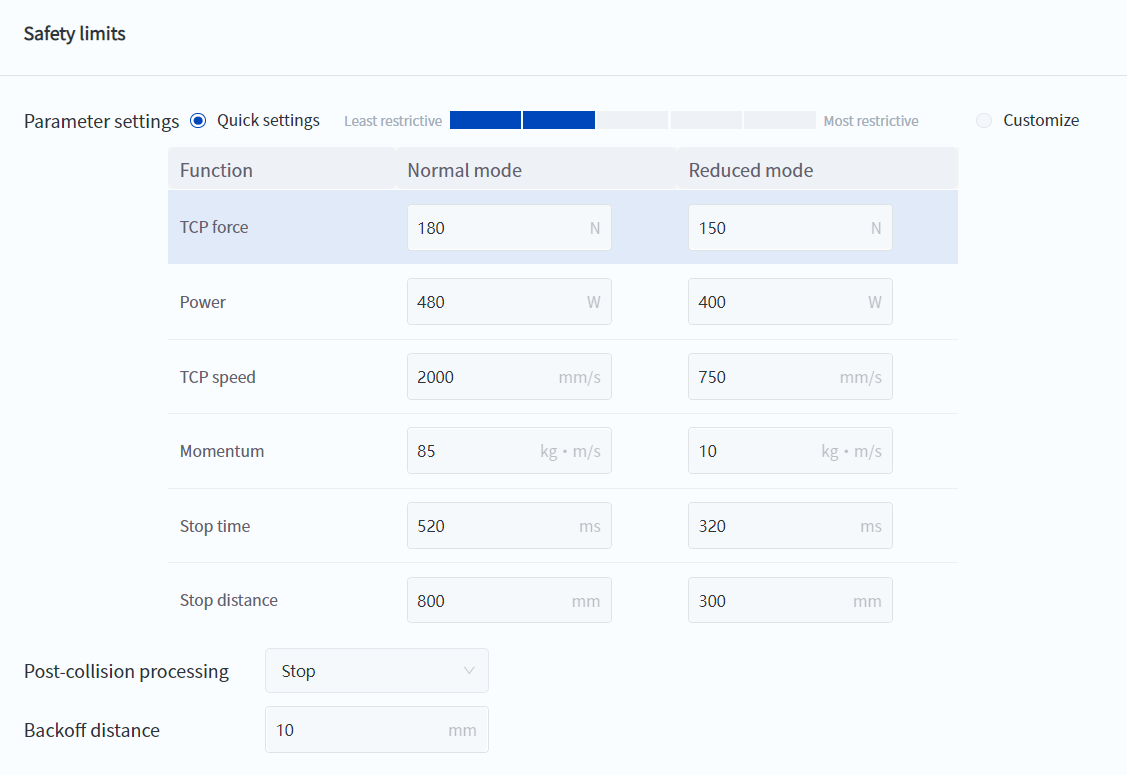 - It should be noted that TCP force and power limits mainly affect the robot's collision detection sensitivity. TCP speed, momentum, stop time, and stop distance limits mainly constrain the robot's maximum movement speed. Therefore, if the robot speed is found to be slower than expected during use, it may be due to unreasonable settings of these parameters.
