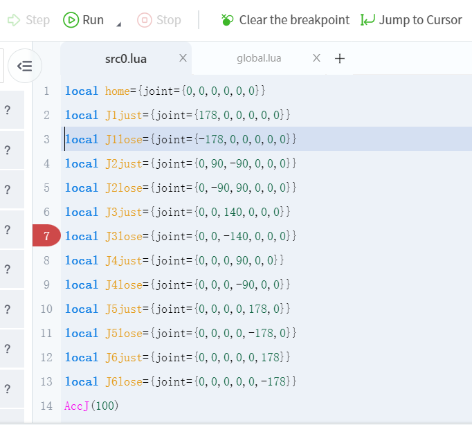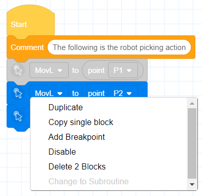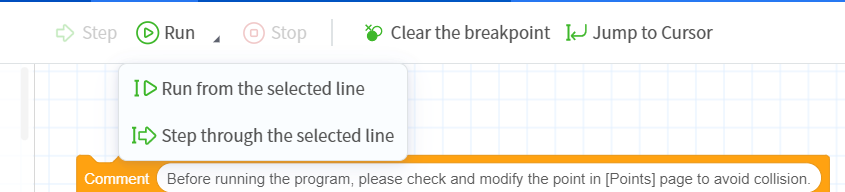 - The "Run from selected line" or "Single-step from selected line" function will allow the robot to skip the program segment before the selected line and start running the program from the specified line. It is very convenient when debugging the middle line of the program. For example, if you have re-taught certain points, you need to re-test to confirm the effect.