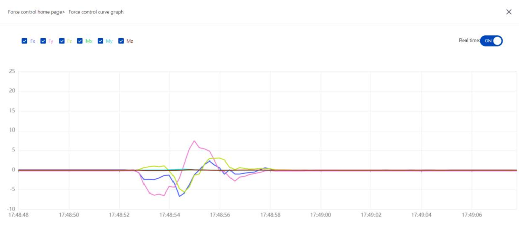 - Supports real-time curve display of force data, which can accurately view the specific values of force control in various directions at different times, and transform abstract force perception into visual data insights, making it easy to compare force control effects under different parameters, or quickly locate force control anomalies (such as overshoot, fluctuation)