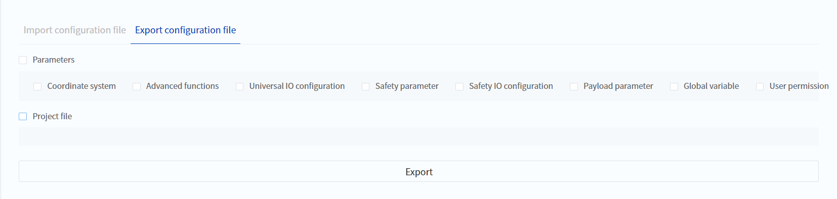 This version provides a "file migration" function, which can batch copy the files and parameter settings of one robot to another robot, including engineering files, IO configurations, safety parameter settings, motion parameter settings, etc., and can import and export each type of file separately. When users are carrying out batch production of equipment, they can complete the equipment parameter configuration with one click, and the time is shortened to less than 1 minute.
