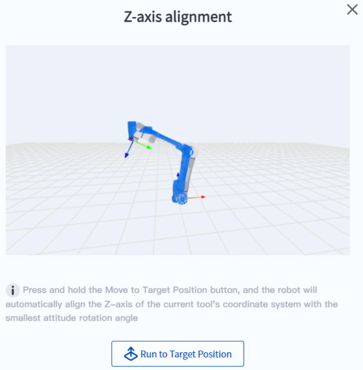 - Z-axis alignment. The robot automatically aligns the Z-axis of the current tool coordinate system with the Z-axis of the current user coordinate system at the smallest posture rotation angle. In many scenarios (such as palletizing, locking, desktop handling, etc.), horizontal grasping can be quickly achieved without fine-tuning the robot angle.