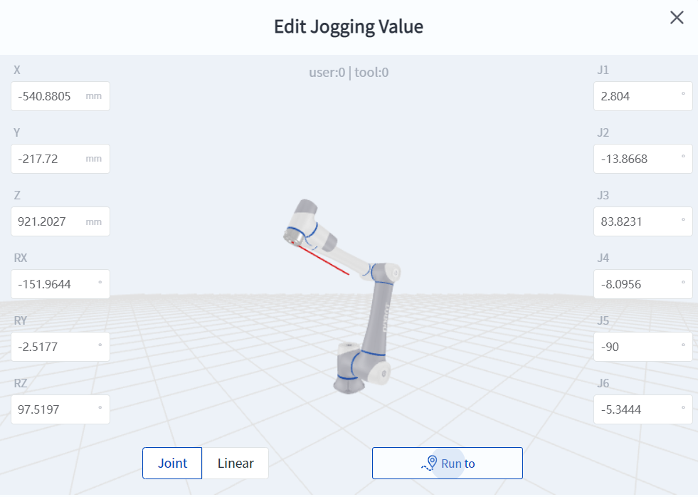- Manually input coordinate values for jogging. You can directly input the robot's joint coordinate values or Cartesian coordinate values for jogging.