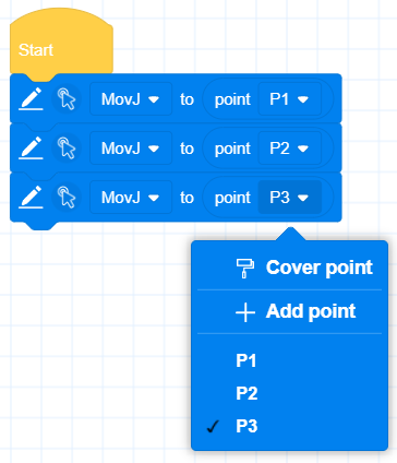 - You can quickly add points to the building blocks or overwrite the current points without switching between the programming interface and the point storage interface, which improves the efficiency of point teaching