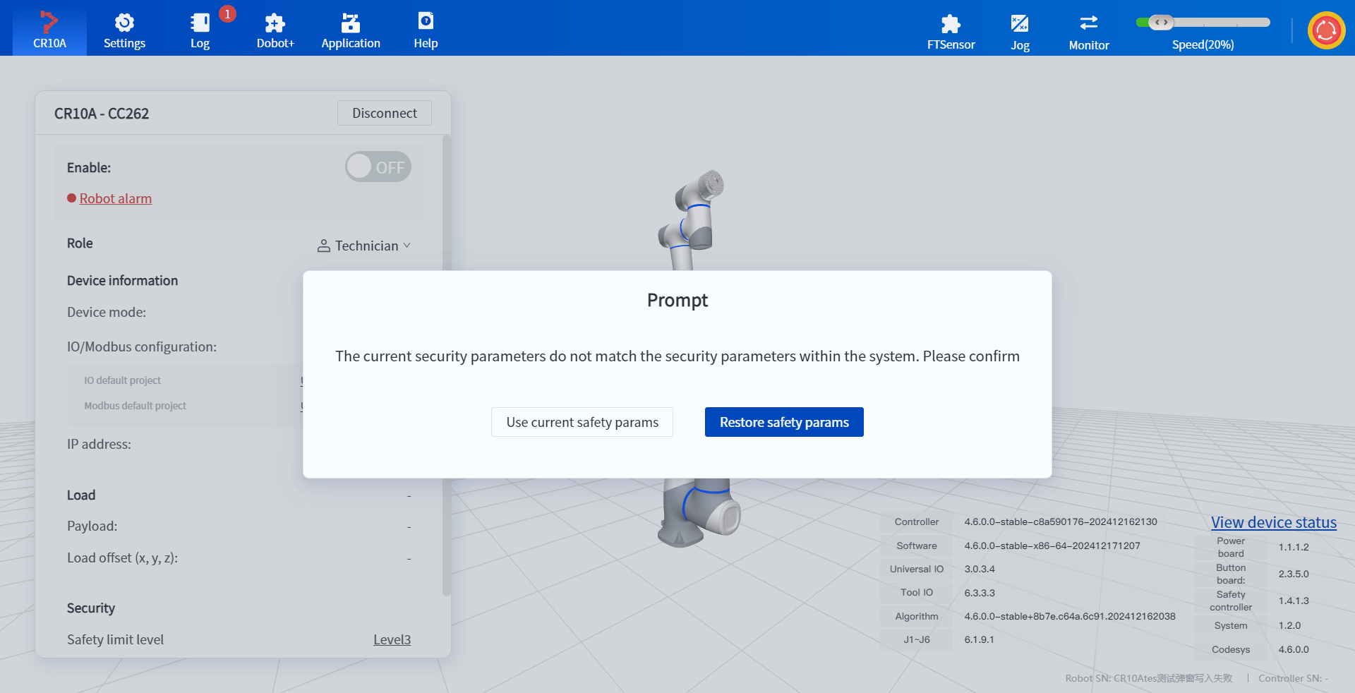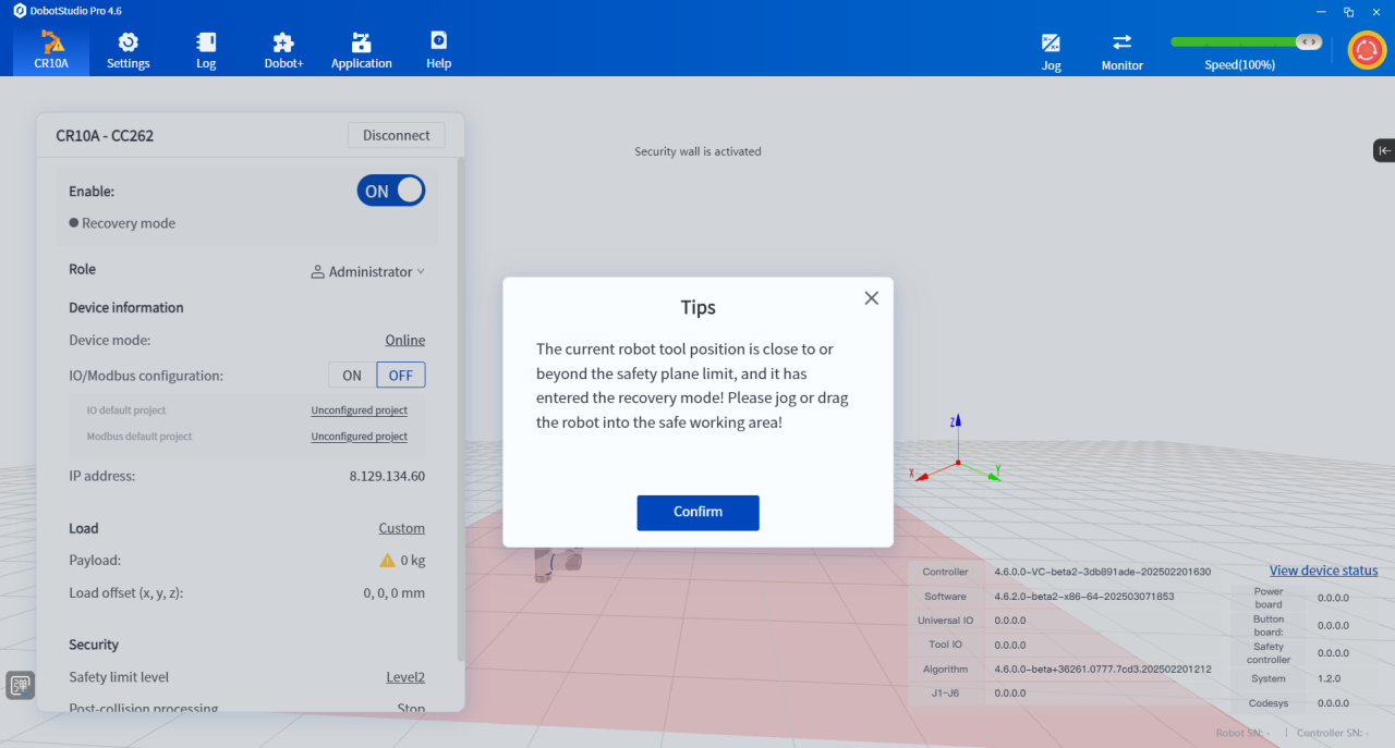 - In recovery mode, the robot status light is orange and the corresponding prompt appears in the DobotStudio Pro software interface, which will help you reasonably judge the current safety status of the robot.