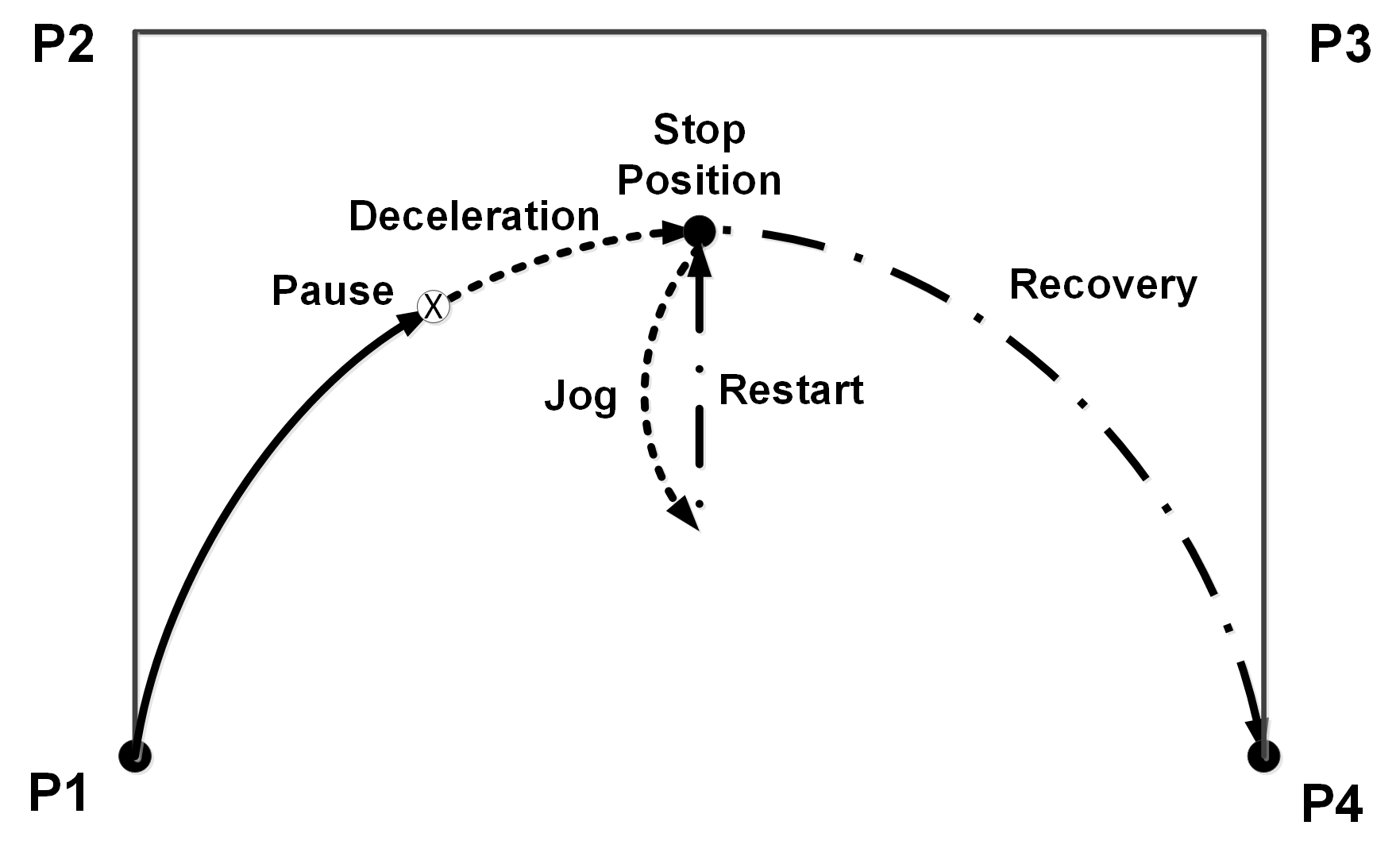 - The robot is triggered to stop at the "pause" position, and after a period of deceleration, it finally stops at the "stop position"