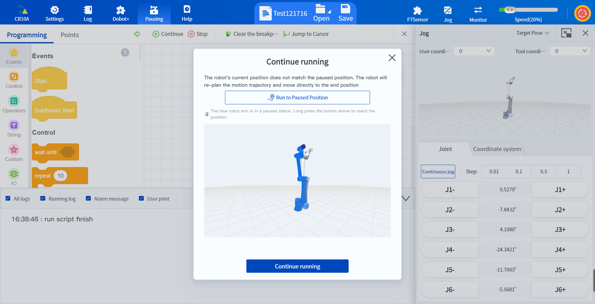- Allow the robot to support jog or drag in the pause state. At this time, click Continue to run and the robot will move slowly to the pause position and then continue to run.